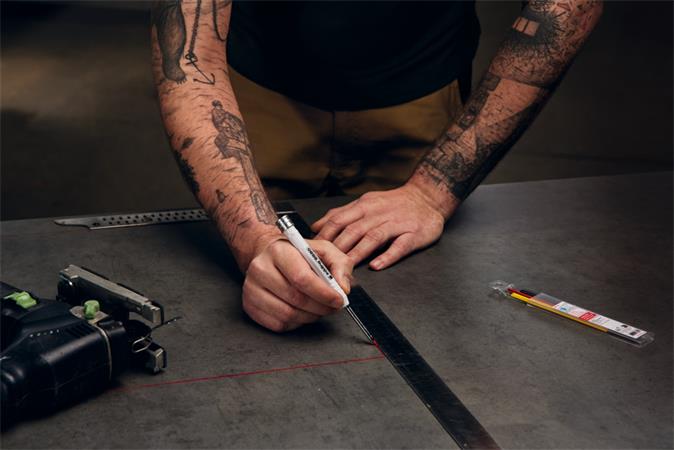 -hosszú (42 mm) és vékony (5,5 mm) hegyfoglalatnak köszönhetően a ceruza még a keskeny vagy más nehezen hozzáférhető helyeken is használható, pl. furatlyukak vagy vágó élek jelölése esetén