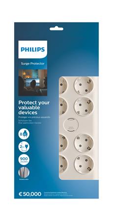 Elosztósor, 8 csatlakozóaljzat, túlfeszültség-védelemmel, 2 m kábel, PHILIPS, fehér
